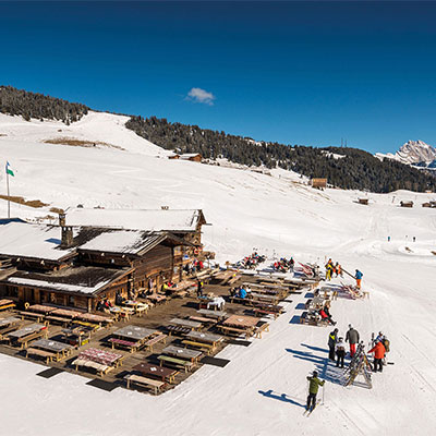 Ortisei 1236 m > cablecar Mont Seuc > chairlift Mezdi > Sanon chairlift > chairlift Steger Delai > chairlift Bullaccia > Kompatsch > chairlift Laurin > chairlift Paradiso > chairlift Goldknopf 2,210 m > chairlift Florian. Option 1: Take the shuttle (for a fee) from Saltria, towards Monte Pana / S. Cristina> Selva Val Gardena or Option 2: Ski back to the cablecar Mont Seuc > Ortisei (see Gardenaronda from Saltria.